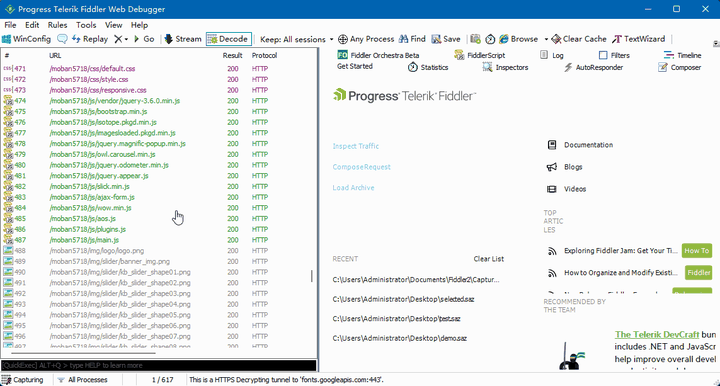 - 启动Fiddler后会自动开始捕获流量